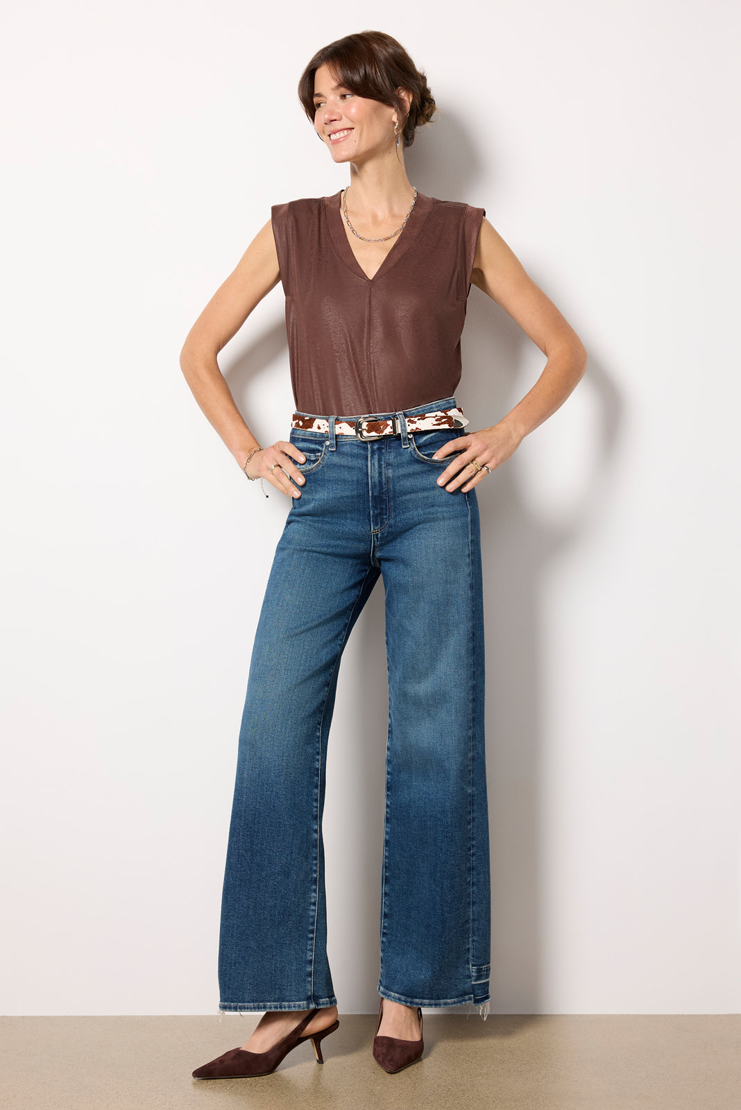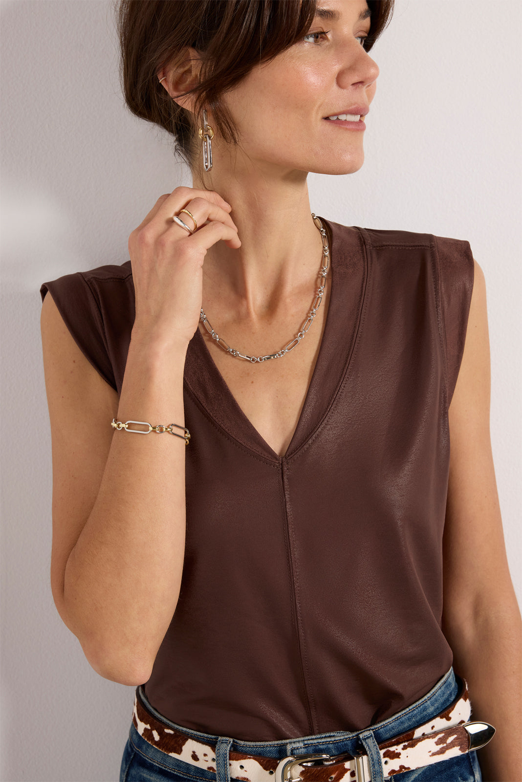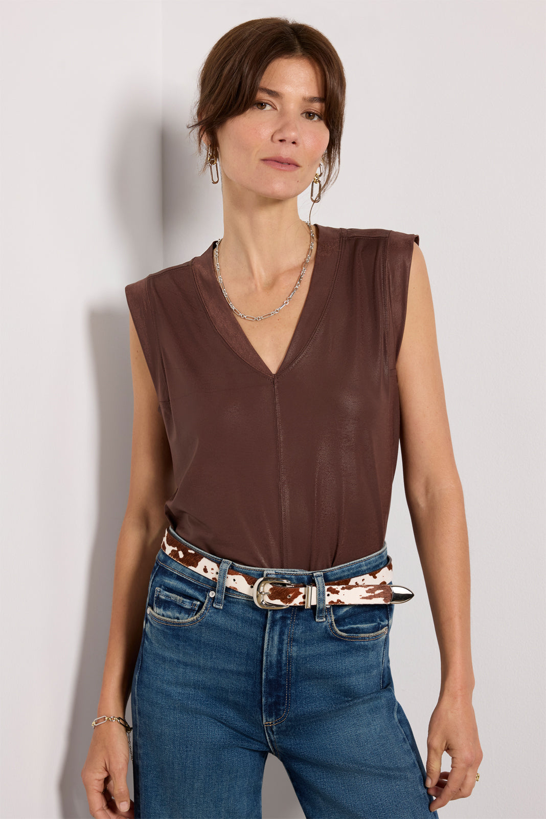 Elevate your night-out look with the Harper sleeveless tee by Luccaskick. finished in coated knit fabric with a v-neckline andvertical frontseam detail.
