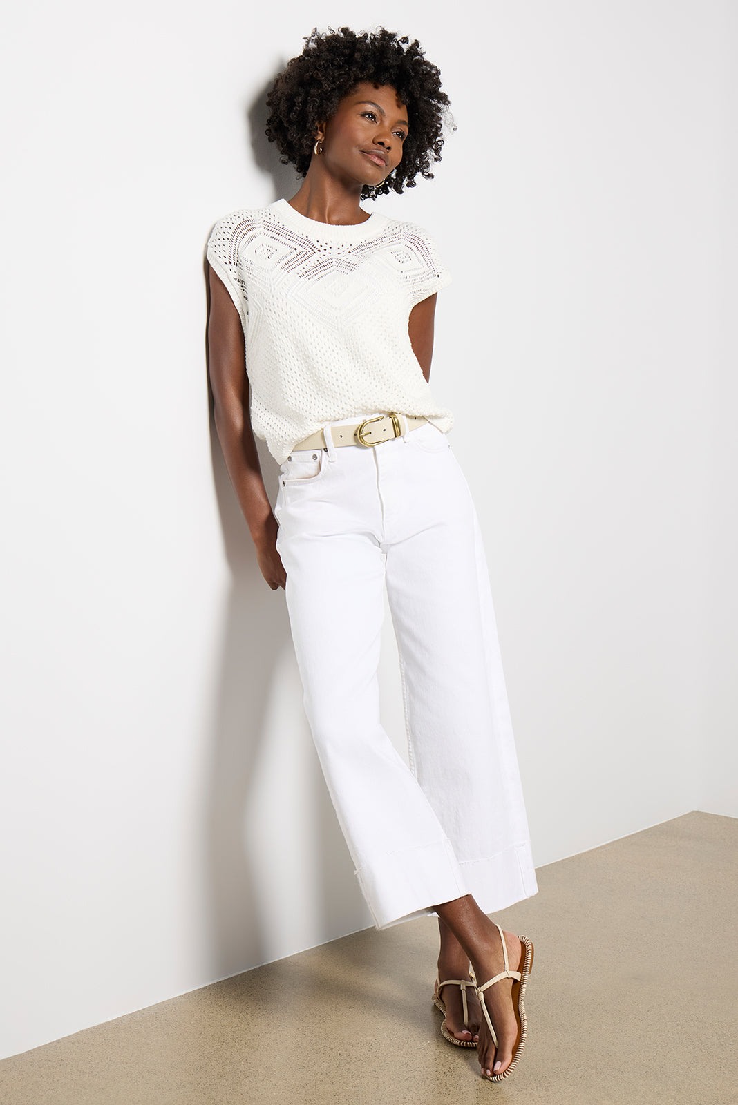 Elevate your summer wardrobe with the Journee crochet pullover by Luccaskick. Finished in a cotton knit with an open stitch design. this chic sweater features a cropped silhouette. ribbed trim. and cap sleeves.